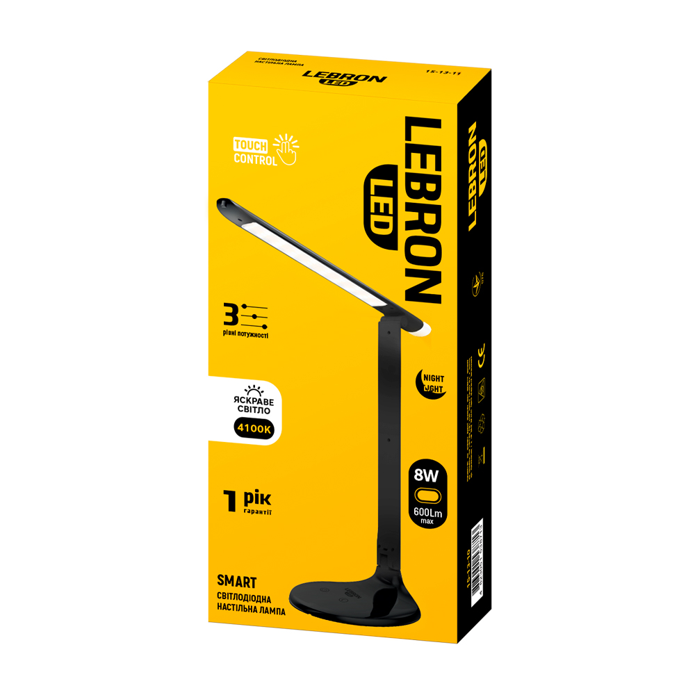LED лампа настільна LEBRON L-TL-L, 8W, 4100K, 3 рівня по-сті, нічник, чорна, з блоком жи-ня