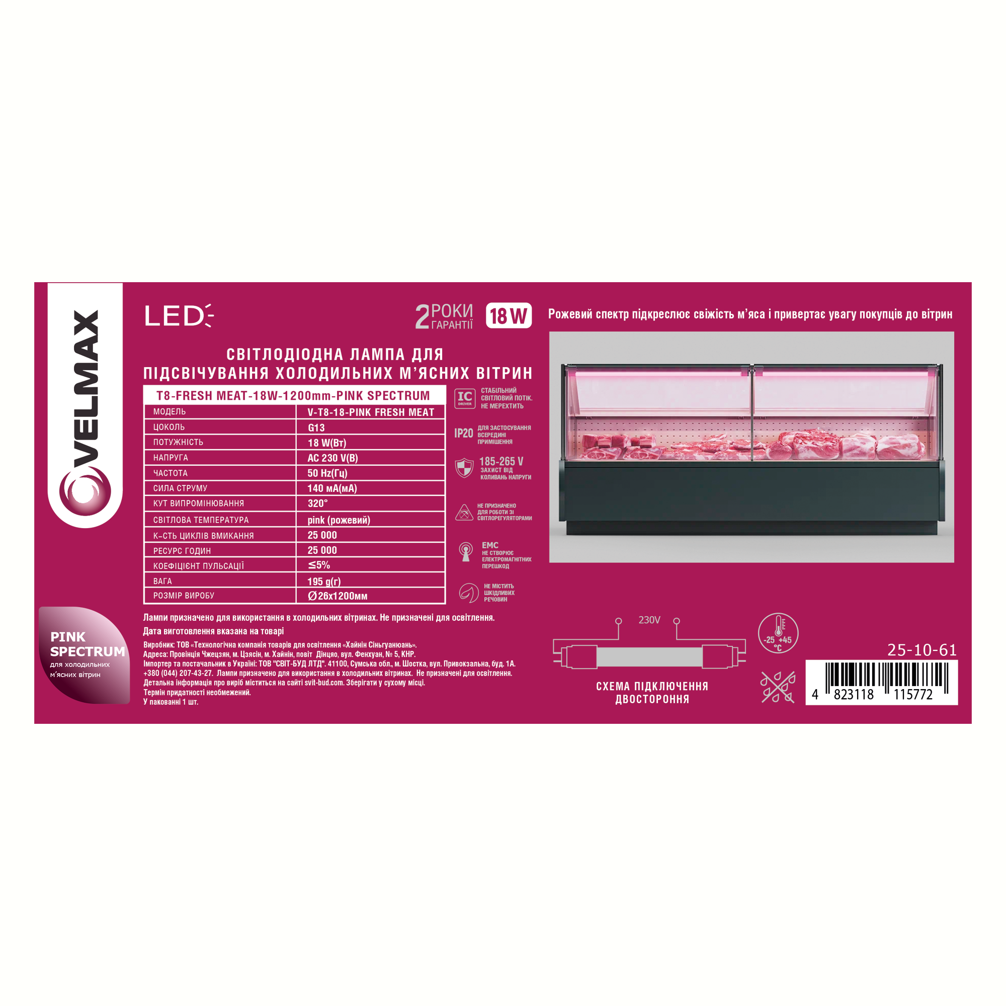 LED лампа VELMAX V-T8-18-PINK FRESH MEAT, 18W, 1200мм, G13, 230V