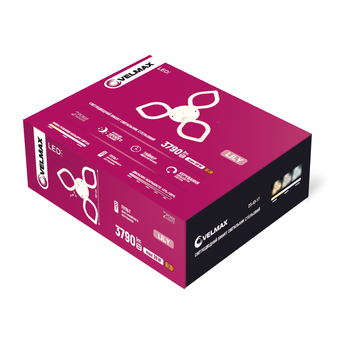 LED світильник VELMAX V-CL-LILY-3Wh, max 39W, 3000K-6500K, пульт, блок живлення, білий, 230V