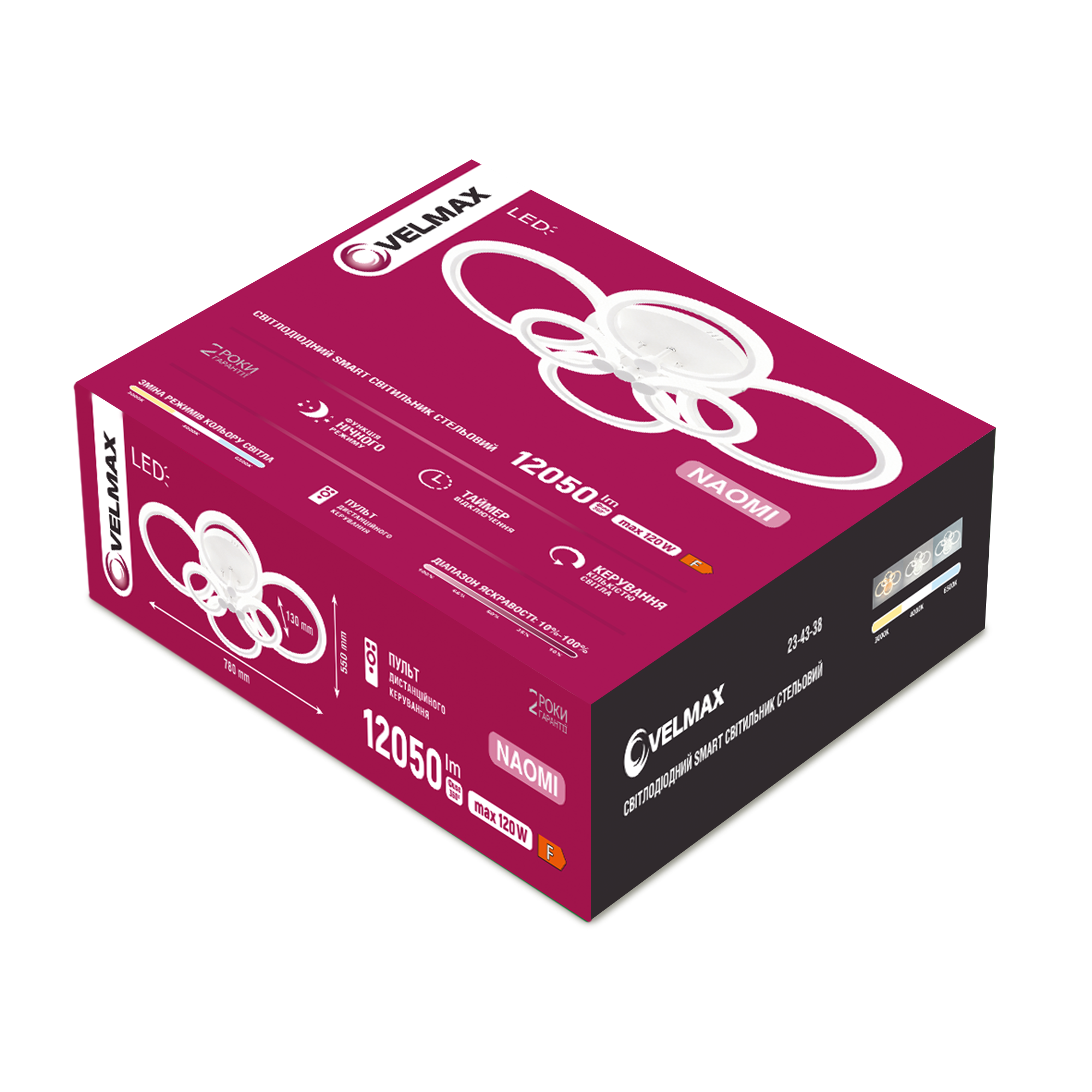 LED світильник VELMAX V-CL-NAOMI-R-120SWh, max 120W, 3000K-6500K, пульт, блок живлення, білий, 230V
