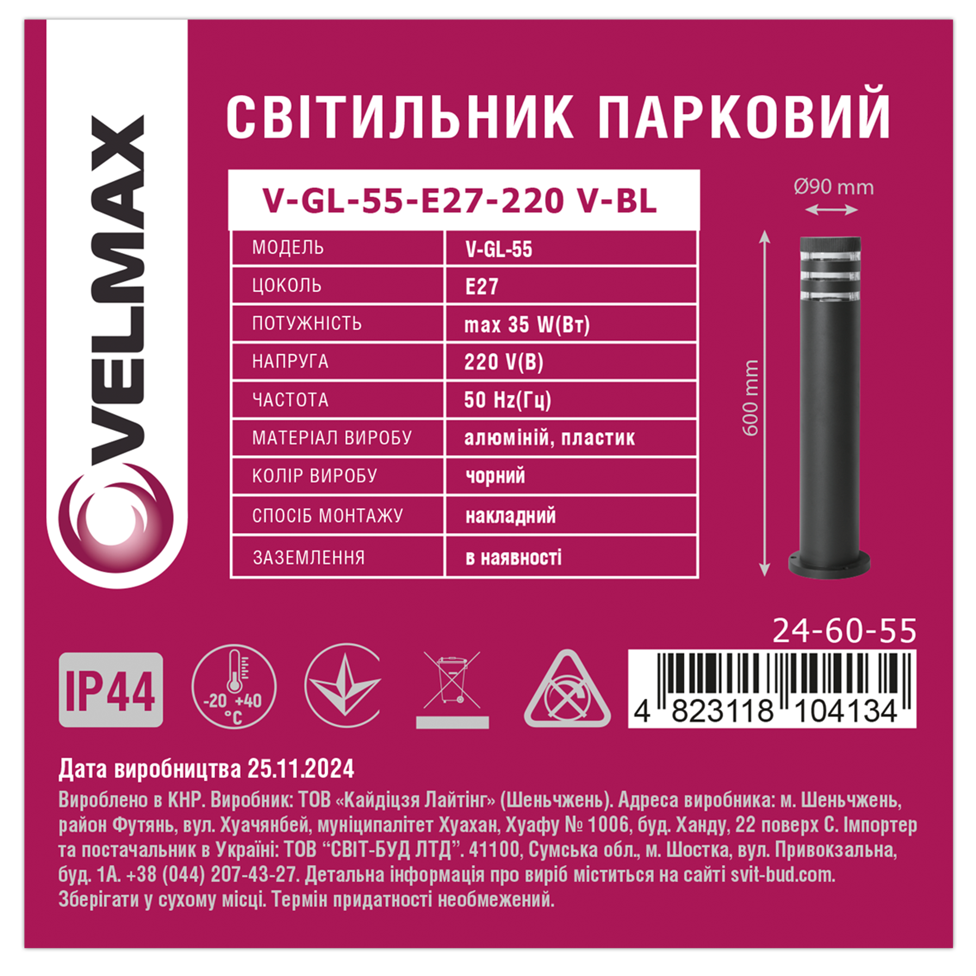 Світильник VELMAX V-GL-55, max 35W, E27, 220V, IP44,