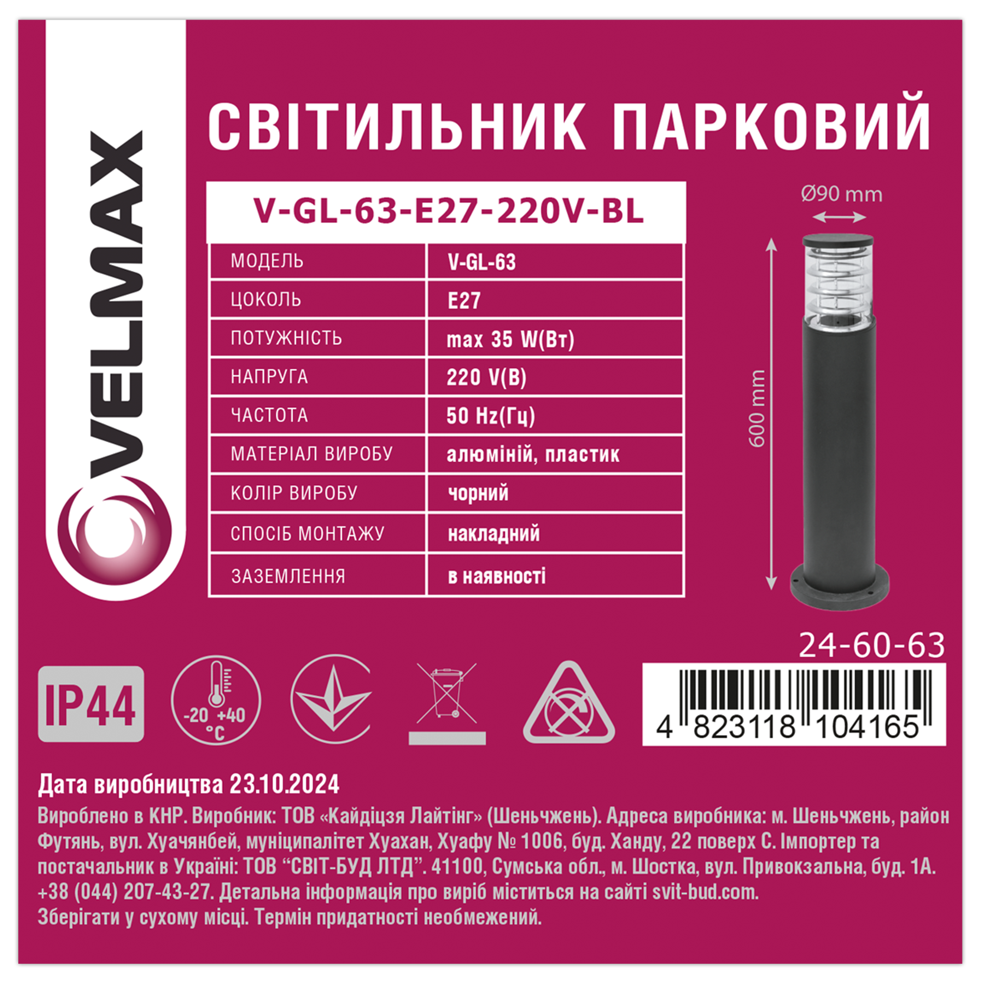 Світильник VELMAX V-GL-63, max 35W, E27, 220V, IP44,